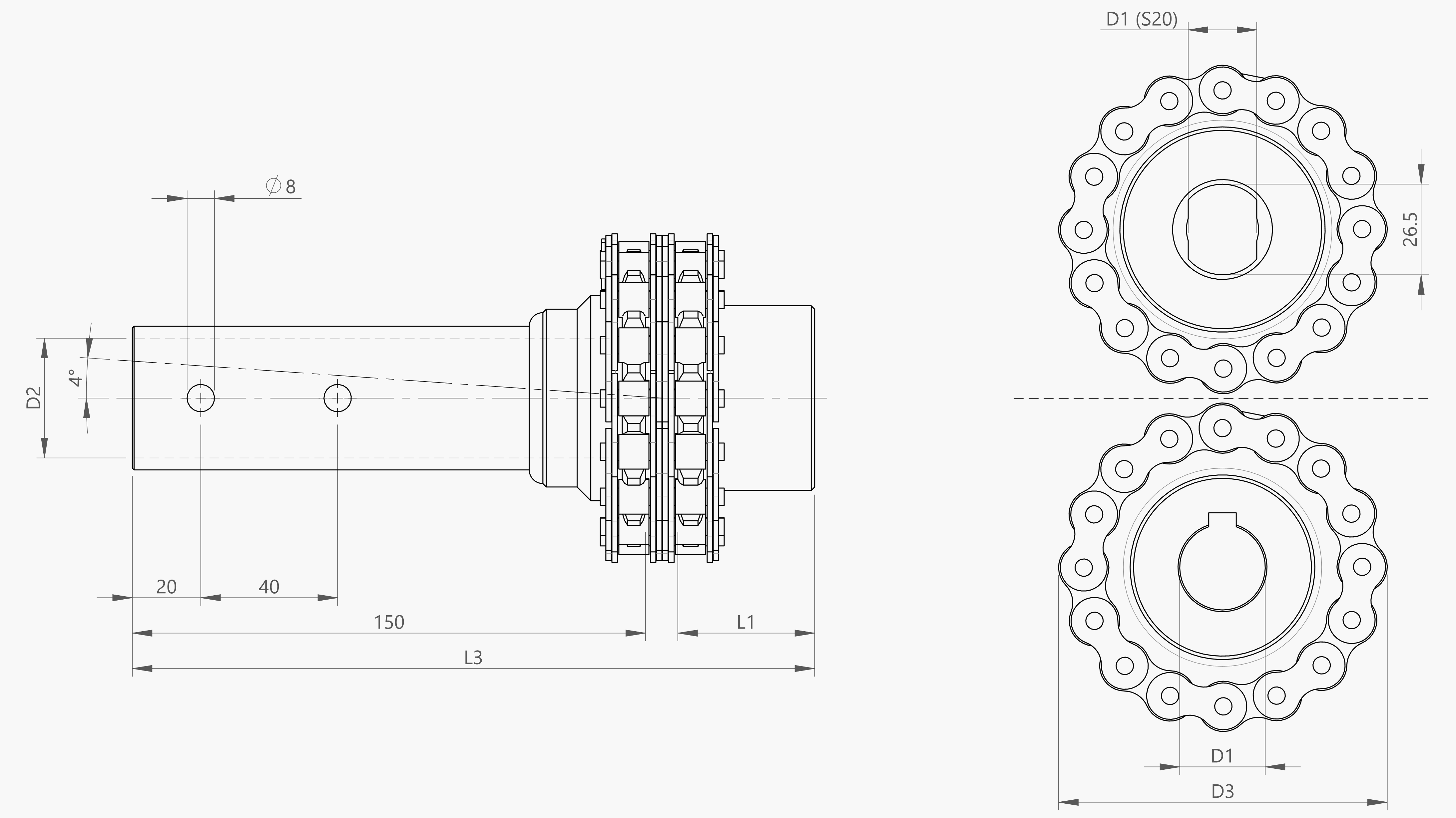 | Artikel | Omschrijving | Tmax [Nm] | Z [tanden] | D1 [mm] | D2 [mm] | D3 [mm] | L1 [mm] | L2 [mm] | L3 [mm] | m [kg] |