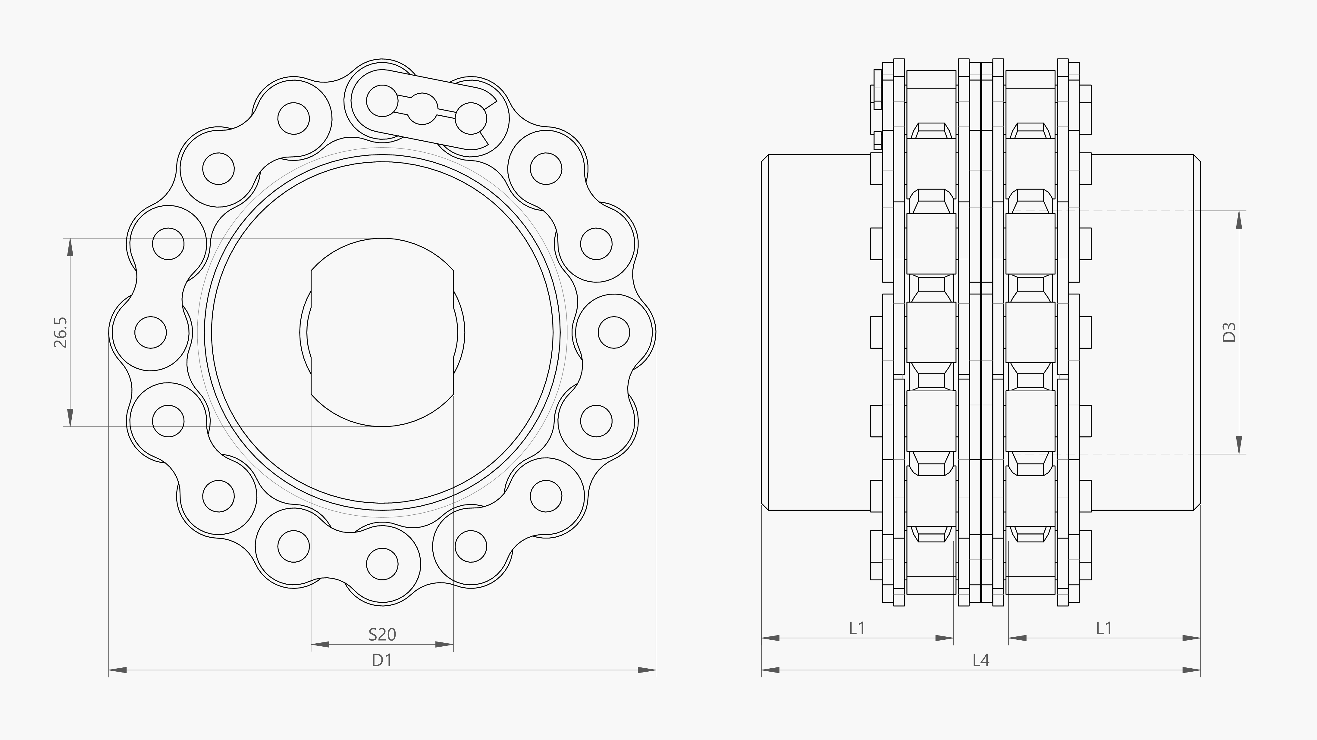 | Artikel | Omschrijving | Tmax [Nm] | Z [tanden] | D1 [mm] | D3 [mm] | L1 [mm] | L4 [mm] | m [kg] |